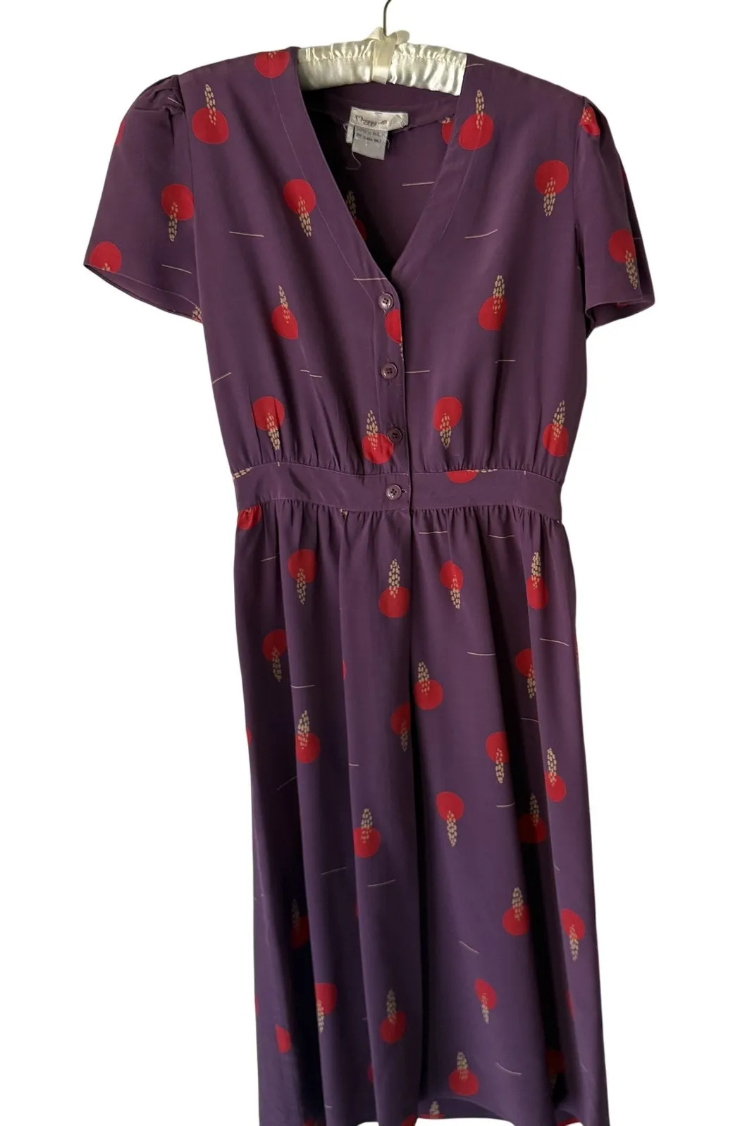 Maggy London Vintage 60s Dress10 Silk Midi Button Short Sleeve Floral Print Condition: Gently worn, no visible flaws 100% silk fabric, lightweight and breathable Purple dress with striking red and beige abstract floral print Short sleeves, V-neck, and button front closure Elastic waistline for comfortable fit and flattering shape Unlined, flowy midi length skirt Brand: Maggy London, tag size 10 Material: 100% silk (see tag for care instructions - dry clean only) Pit to pit: approximately 18 inches Waist: approximately 13.5 inches across (elastic) Length: approximately 39 inches shoulder to hem Classic and feminine style, perfect for spring, summer, or casual occasions See all photos for details and measurements