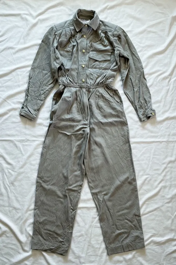 A sharp and minimal 1980s Maggy London jumpsuit with western detailing. Perfect for the office or styled up. Brand & Era: Maggy London Petites by Jeannene Booher, vintage (1980s) Fit: Vintage tag of women's size 4 but fits more like modern women's size 0–2, petite fit with padded shoulders, elastic waist, and straight leg Features & Closure: Pointed collar, button front, padded shoulders, golden eagle buttons, pleated back, front chest flap pocket, hip pockets, elastic waist, possibly hemmed legs Fabric & Color: 100% rayon in khaki-brown Origin: Made in Korea Condition: Good used vintage condition — hole in one pocket, three small back snags, and some loose threads (shown); overall minimal wear Measurements: Length: 49 inches Bust: 31 inches (15.5 inches flat) Waist: 24–26, stretches (12-13 inches flat) Sleeve: 20 inches Inseam: 23 inches Style Tags: indie vanguard, minimalist renaissance, westerncore, retro utilitarian, soft grunge, 80s vintage, quiet luxury, neutral