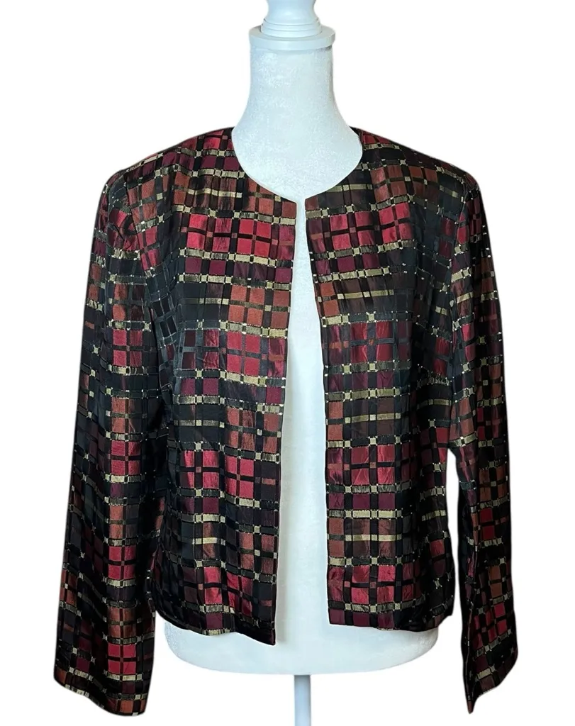 MAGGY L (Maggy London) elegant late 90s-early 2000s vintage open-front topper jacket/bolero blazer boxy short jacket Women’s size 6 (vintage sizing: see measurements below) Excellent pre-owned condition Features a rich woven plaid/grid pattern in metallic colors of red, copper, gold, and black. Lightly padded shoulders. Collarless silhouette with a slightly cropped, structured fit—perfect for evening wear, holidays, weddings, or special occasions. Made in the USA. Details: • Open front, no closure • Collarless neckline • Long sleeves • Woven metallic grid/check pattern • Fully lined • Dressy, structured evening jacket Approximate measurements: Underarms across the back inside: 20” Length from shoulder: 19” Sleeve length: 23” BIN 4
