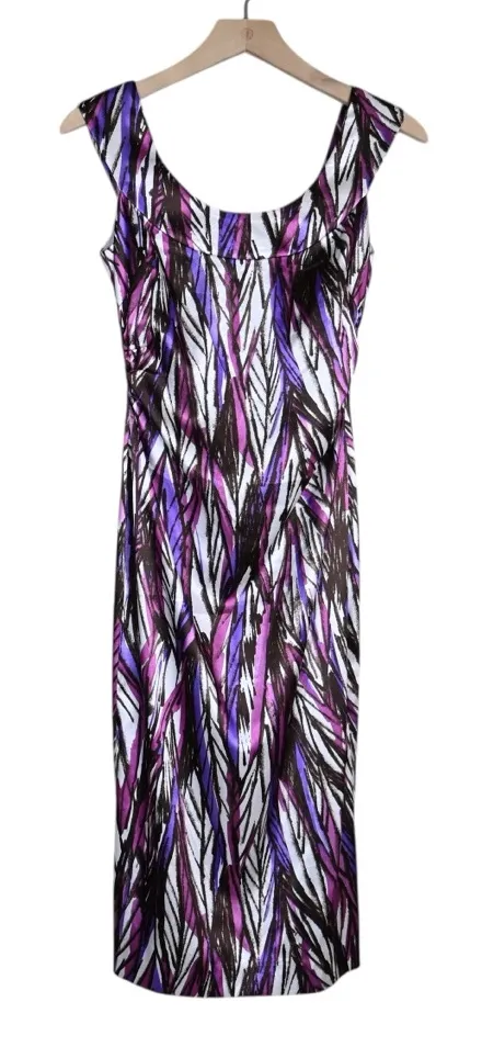 Maggy London Women's 0 Leaf Pattern Sheath Dress in Cream Purple Brown Very good preowned condition. Size 0. COLOR: Purple, Cream, Brown Step out in style with this elegant purple and brown dress. Perfect for any occasion, this dress combines comfort with a chic design. Leaf pattern Hidden side zipper Seam at bust for flattering fit Lined Silky texture Light stretch Below knee length SHELL: 97% polyester, 3% spandex LINING: 95% polyester, 5% spandex Dry Clean Approx measurements: Pit to pit 16" Waist 14" flat lay Length 41"