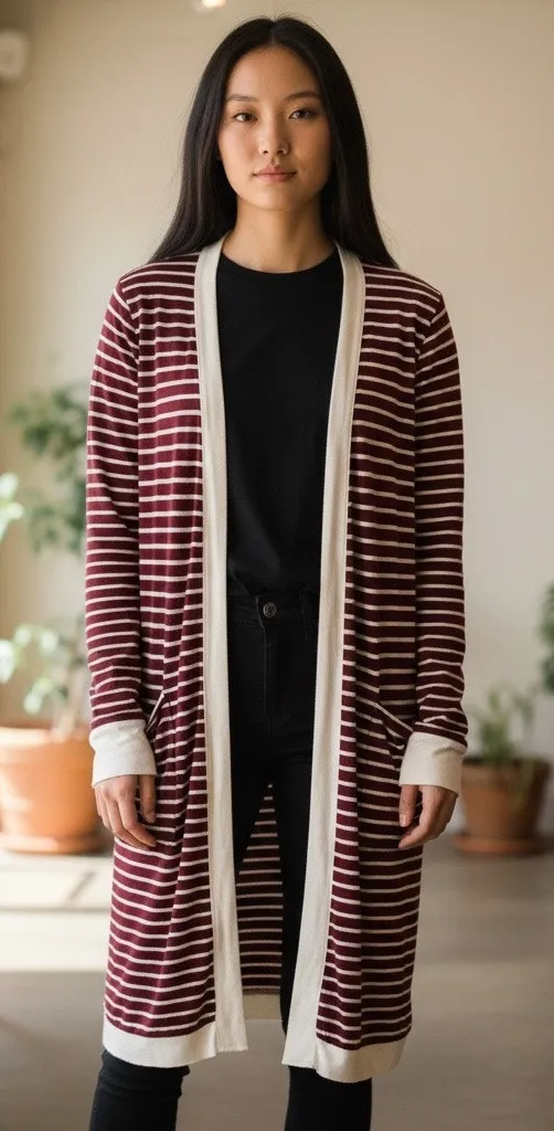 This Magic Fit open jersey cardigan is a stylish and comfortable addition to any wardrobe! The burgundy and white stripe pattern is eye-catching, and the soft rayon spandex blend jersey fabric drapes beautifully for casual or office layering. It features long sleeves, two front pockets, and a relaxed fit that's perfect for lagenlook, cottage core, nautical, holiday, or cold weather wear. Dress it up for office chic or wear it casually for a comfortable and stylish look! This cardigan is in excellent condition and ready to wear. Features: - Rayon Spandex Blend - Stretchy jersey, Lightweight - Long sleeves - Lagenlook - Cottage Core - Nautical - Holiday - Cold Weather Wear - Office Chic - Drapes beautifully for casual or office layering. - Relaxed Fit - 2 front pockets - Size Small Shoulders 18" Pit to Pit 19" Back to Hem 36" Used item in excellent condition, no flaws noted, see pics. Please check your measurements.