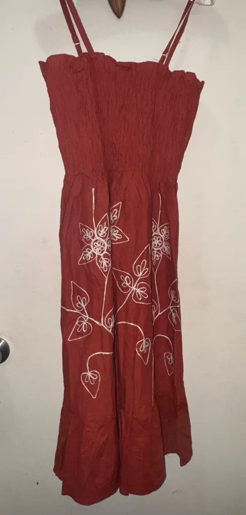 The Magic sundress in vibrant red is designed with a smocked bodice and elegant spaghetti straps, making it a perfect choice for a wedding guest or cocktail event. Its A-line silhouette is adorned with white floral patterns, adding a touch of sophistication. The sleeveless design and lightweight fabric ensure comfort for a night out. NWOT