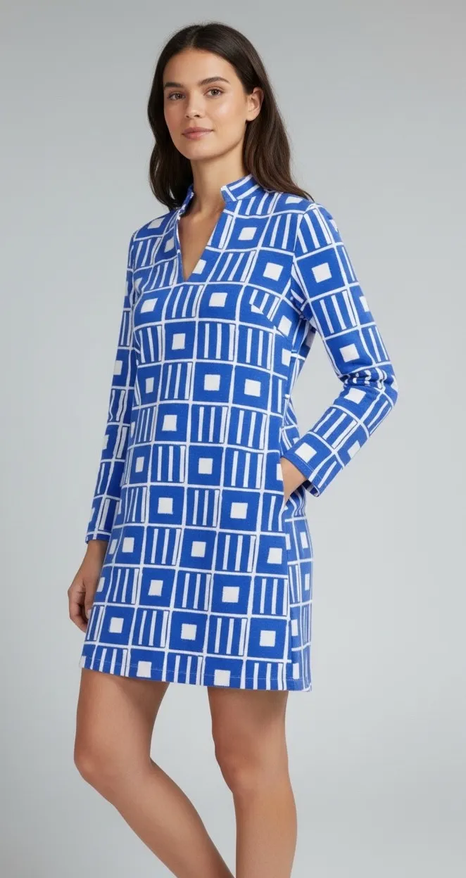 A blue and white geometric print tunic dress by Mahi Gold. This dress features a classic V-neckline, long sleeves, and a comfortable straight hemline. The vibrant geometric pattern adds a playful touch to this versatile piece, making it perfect for a casual day out or a beach vacation. Measurements: • Bust: 23 in • Length: 37 in Style: Shift, Shirt Dress Dress Length: Short Department: Women Sleeve Length: Long Sleeve Pattern: Geometric Material: Cotton, Lyrca Fabric Type: Knit Theme: Beach Neckline: V-Neck Season: Summer Sleeve Type: Bell Sleeve Closure: Pullover Keywords: Mahi Gold, tunic dress, geometric print, blue and white, long sleeve dress, casual dress, beach dress, resort wear, vacation dress, preppy, nautical, golf dress, sporty