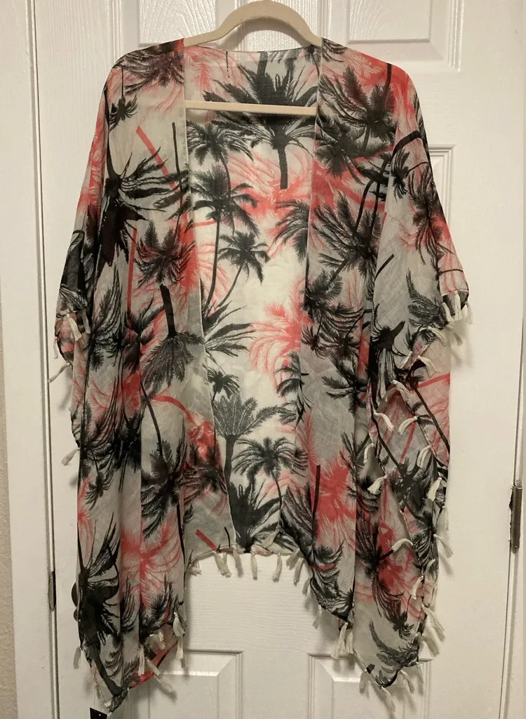 Mahina Hawaii Boutique Tropical Palm Print Kimono Swim Cover Up New With Tag White with Red & Black Palm Tree Print Fringe on Outer Edges 100% Polyester Width: 41” Length: 30” Size One Size
