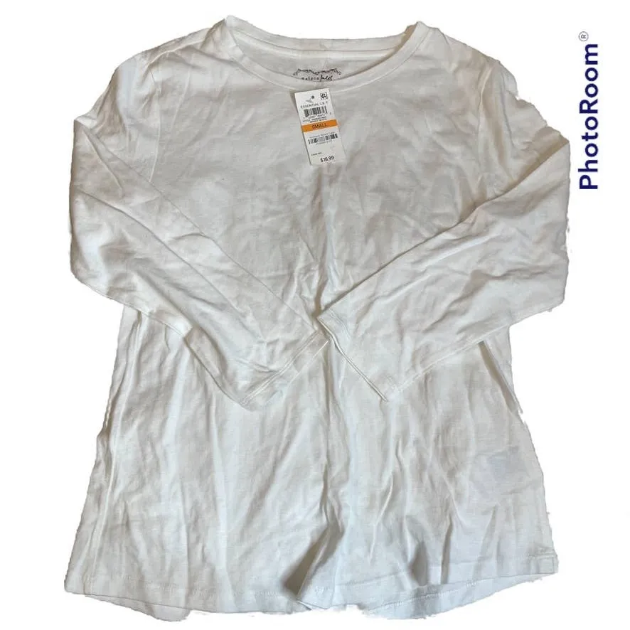 Maison Jules Essential LS T Bright White long sleeve t-shirt. A classic wardrobe staple, this t-shirt offers a comfortable and versatile base for any outfit. Its simple design and bright white color make it easy to pair with various bottoms and layers. Perfect for casual outings, running errands, or layering under a jacket for cooler weather. Approximate Measurements In Inches Pit to Pit 17 Length 24 Sleeve 19 Type: T-Shirt Department: Women Style: Basic Material: Cotton Blend Neckline: Crew Neck Sleeve Length: Long Sleeve Sleeve Type: Classic/Fitted Sleeve Pattern: Solid Features: Tagless Fit: Regular Fabric Type: Knit Occasion: Casual Closure: Pullover Season: Spring, Summer, Fall, Winter Garment Care: Machine Washable Keywords: Maison Jules, essential tee, long sleeve, basic, crew neck, casual wear, everyday, layering piece, solid white, comfortable, wardrobe essential, bright white Excellent used condition.
