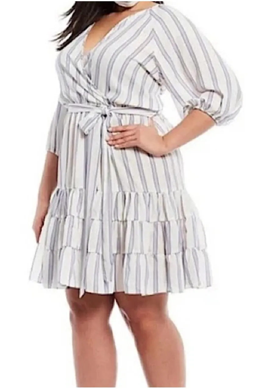 Maison Tara Dress Size: 20W New with Tag * Faux Wrap Dress * Short Mini Length * color: Blue and White * Sleeve Length: 3/4 Sleeve * Pattern: Striped * Occasion: Casual, Party/Cocktail, Travel * Material: Polyester * Neckline: V-Neck * Sleeve Type: Puff Sleeve * Elastic Waist with Tie closure * Ruffle hem line Measurements laying flat: Pit to Pit: 27" Waist (not stretched): 20" Length from shoulders: 43" Keywords: Maison Tara dress, striped dress, mini dress, plus size dress, 20W dress, tiered dress, ruffle dress, tie waist dress, 3/4 sleeve dress, white and blue dress, boho dress, casual dress, summer dress, wrap dress Orders ship next business day. Smoke free home.