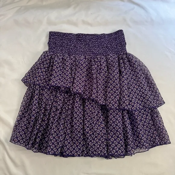 This item is in good condition and free from rips, stains, or tears. Please note that it appears that this skirt has been altered from a high waist to a mid rise. This floral-print high-rise skirt features a tiered flared silhouette. Smocked waist Pull-on style Lined Polyester Hand wash