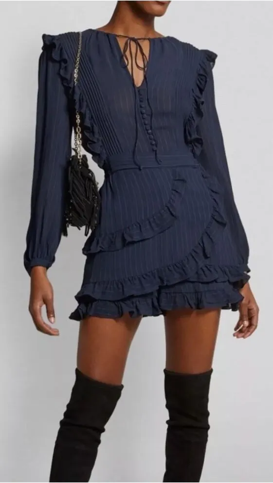 Maje Ruffle Long Sleeve Romper Bleus Istra Ruffled Crepe Playsuit in Navy Blue Ruffle trim and subtle stripes make this long-sleeve romper a sophisticated style standout. Hidden back-zip closure Split neck with ties Long sleeves 93% viscose, 7% cotton Size 34 = US XS Armpit to armpit is approx 18" Waist is approx 11.5" Hip is approx 19" Inseam is approx 2.5" Length is approx 30" Ready for a new home ♻️ Feel free to ask any questions! _____________ About Spin + Thrift *Accepting all reasonable offers. *We ship same or next business day. *Smoke free home. *Shop with confidence over 5500+ 5 star ratings, *New items added daily!