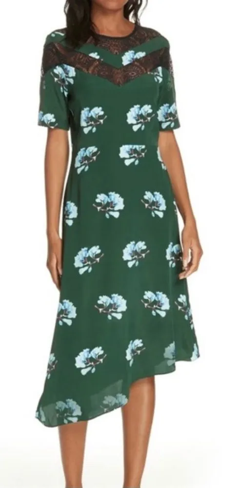 Romantic and feminine Maje Rowers dress crafted from a luxurious silk blend with an elegant asymmetric hemline and delicate lace paneling at the neckline and shoulders. Features short sleeves, side zip closure, and a flattering midi length that works beautifully for both daytime and evening occasions. Seen on celebrities and loved for its effortless French-girl chic style. • Size: 1 (Small) • Color: Deep green with light blue floral print & black lace • Material: Silk blend with lace detail • Closure: Side zip • Details: Short sleeves, asymmetric hem, lace insert neckline • Condition: Excellent pre-loved condition Perfect for weddings, garden parties, date nights, vacations, brunch, and special events — a timeless piece that embodies quiet luxury and Parisian style. maje rowers dress, maje silk floral midi dress, green floral lace midi dress, asymmetric hem dress, french parisian chic dress, quiet luxury event dress, wedding guest dress, rehearsal dinner dress, garden party dress, celebrity style maje, kelly ripa dress, elegant silk midi, cocktail party dress, summer wedding guest outfit, elevated brunch dress, european vacation dress, timeless designer midi dress