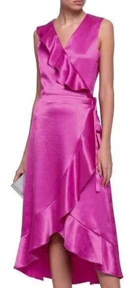 Maje Satin Sleeveless V-Neck Ruffle Trim Wrap Midi Dress Fuchsia Women's Size 1 / S MSRP: 520$ Item... Show more