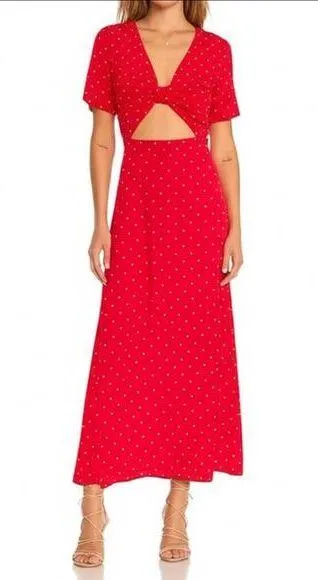Maje Women's Red Polka Dot Textured Floral Tie Front Cutout Midi Dress - Size 36 - Excellent pre-owned condition - Measurements: arpmit to armpit: 16.5, length: 50.5, waist: 11.5 All measurements were taken with product flat lay Please refer to pictures for material content Feel free to contact me for more pictures or questions
