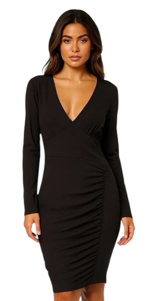 IN EXCELLENT PRELOVED CONDITION SIZE: EXTRA LARGE Stunning black Majorelle midi dress featuring a deep V-neckline, long sleeves, and gorgeous body-flattering ruching down the front and back. Super chic, elegant, and perfect for a night out, date night, cocktails, or any event where you want a little drama in the silhouette. The stretchy ribbed fabric hugs beautifully without being restrictive. Ruching is fixed. Features: • Deep V neckline • Long sleeves • Ribbed stretchy fabric • Full ruching detail front + back • Midi length • Pull-on style • Flattering, curve-enhancing fit Approx. Measurements: • Bust: 18” across • Waist: 14” across • Length: 41”