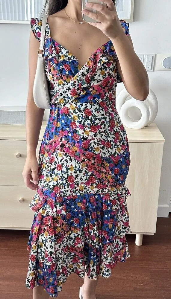 REVOLVE, Majorelle Nolita Ruffle Floral Midi Dress in Patchwork Multi Size Large Details/Features: - Fully lined. - Tiered ruffle trim. - Adjustable shoulder straps. - Hidden side zipper closure. - Imported. Materials: - Self & Lining: 100% rayon. - Hand wash cold. Gently pre loved condition, no flaws