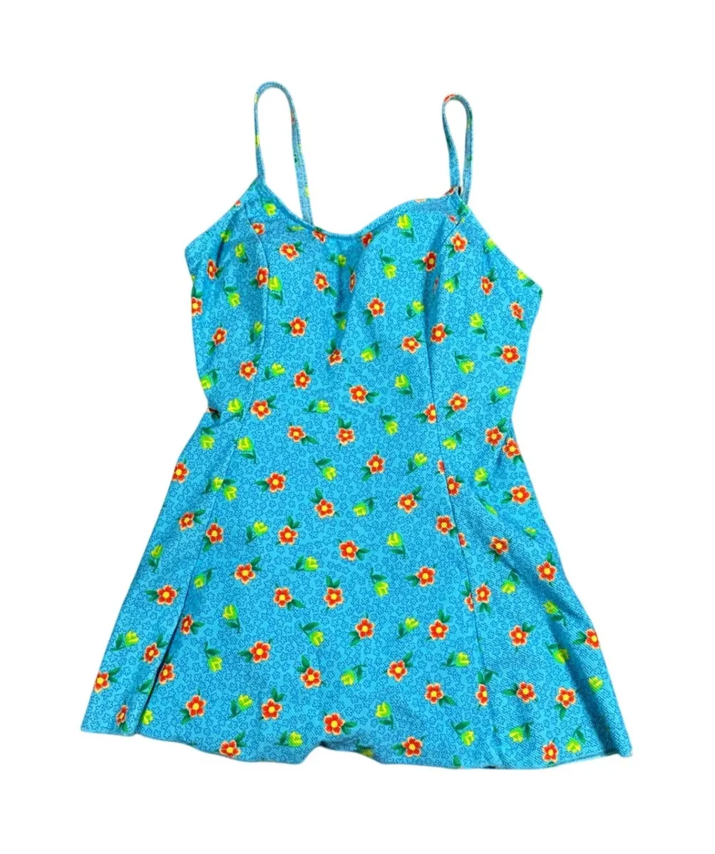A ray of sunshine, this vibrant dress radiates playful charm. Sprinkled with a delightful floral print in radiant orange and fresh green, set against a backdrop of sky blue, this mini dress is designed to captivate. Its flattering silhouette and delicate spaghetti straps offer a touch of elegance, while the built-in bust support ensures a comfortable and confident fit. Perfect for a casual day out, a picnic in the park, or a fun summer party, this dress promises to turn heads and evoke joy. Style: Slip Dress, Mini, Sundress, A-Line Dress Length: Short Department: Women Sleeve Length: Sleeveless Pattern: Floral Occasion: Casual, Party/Cocktail Material: Nylon, Spandex Neckline: Sweetheart Theme: Retro, Floral Fabric Type: Woven Season: Spring, Summer Sleeve Type: Strappy Sleeve Closure: Pullover Keywords: floral dress, mini dress, sleeveless dress, blue floral dress, orange floral dress, vintage dress, retro dress, Body I.D. dress, women's dress, size 10 dress, spaghetti strap dress, summer dress, casual dress, 90s dress, y2k dress