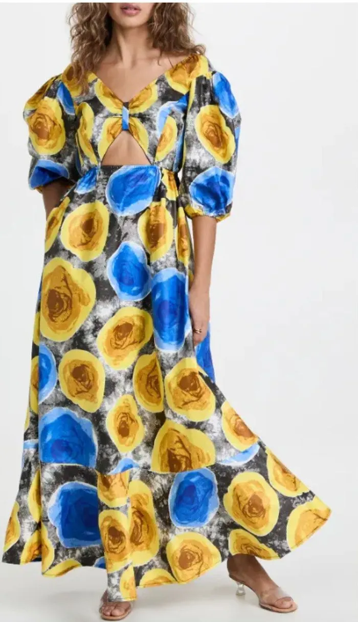 Size US 10 Excellent, pre-owned condition. No flaws. Thanks to a sweeping silhouette and one of the label's signature striking prints, this Mangishi Doll dress is sure to steal the show. Keep the focus on this piece by pairing it with understated footwear. Fabric: Mid-weight, non-stretch poplin Swirl print V neckline with gathering detail Cutout at front Puff sleeves Elastic waist with hidden zip at back On-seam hip pockets Shell: 100% cotton Lined bodice, unlined skirt Wash cold Imported, Zambia Style #MANGI30020 RETAIL $209 Sold out online, sold at ShopBop Tags: statement, event, party, cutout, open back, colorful, whimsy, whimsical Bust: 16.5" Length: 56" Not sure if it will fit? Measure 1 or 2 of your favorite clothing items and compare. Measurements are approximate flat-lay.