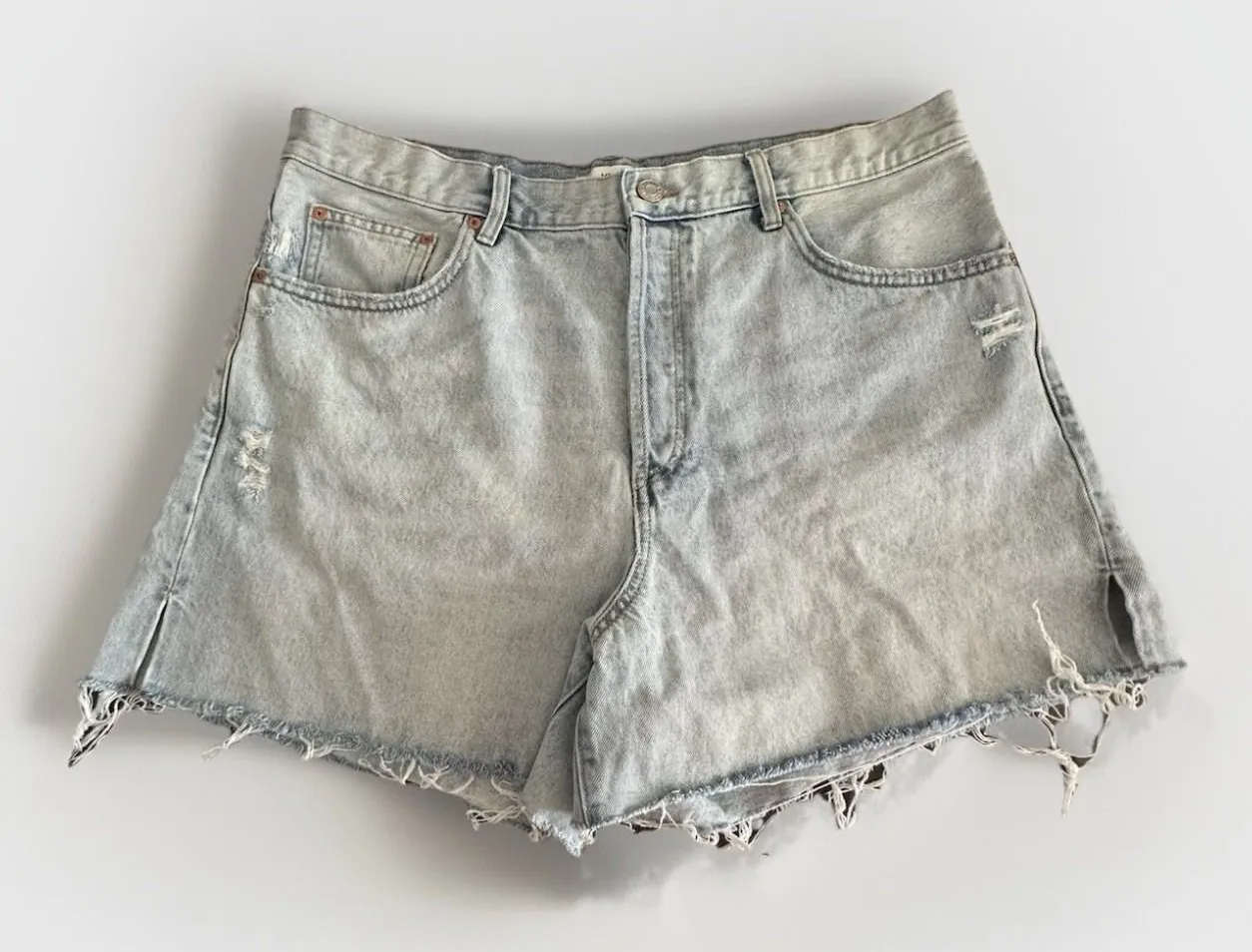 MNG (Mango) Andy jean shorts with strong rodeo-core western energy. Light wash denim with a raw cut-... Show more