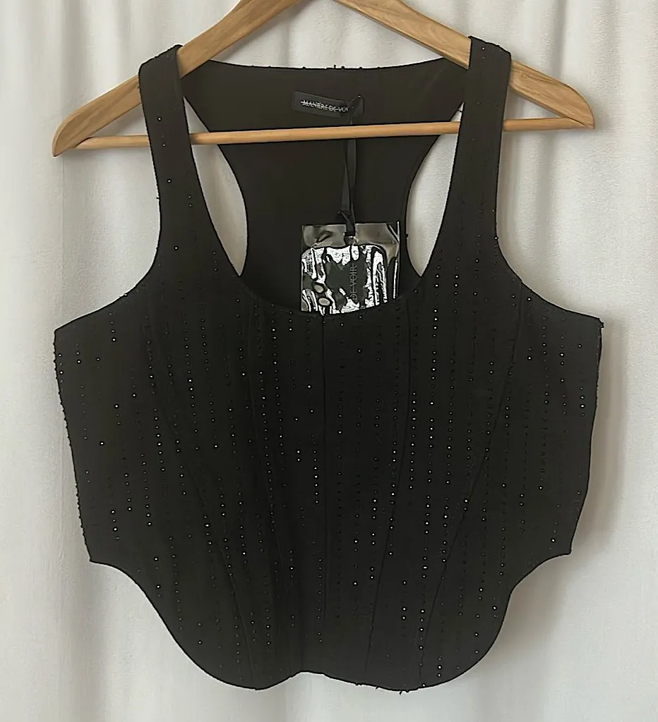 Elegant NWT black corset shirt top by Manière De Voir. Perfect for any occasion. • Corset hook and eye front closure • Made of 100% cotton **Comes from a clean, smoke free home**
