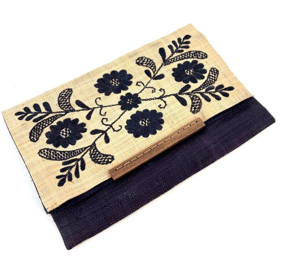 Mar Y Sol Clutch Bag Floral Embroidered Wooden Navy Color - Navy blue on tan background Delicate... Show more