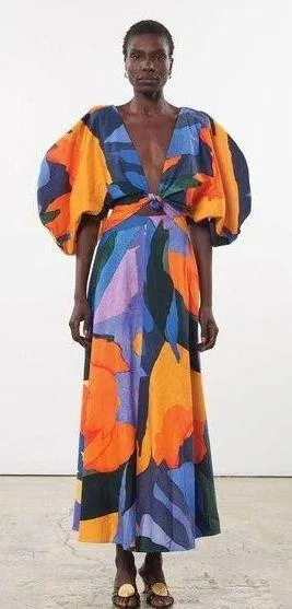 A-line dress with sculptural shoulders, open back, and plunging v neckline with knot detail at sternum and rear neck. Relaxed bodice and high, fitted waist with hidden back zipper closure; full a-line skirt cropped at ankle. Made from organic cotton with a custom all-over watercolor print, hand painted in-house exclusively for Mara Hoffman. Size: 6 Color: Multicolor Allover print 100% organic cotton woven Made in USA Puff sleeves Plunge v-neck Twisted details Ankle length Excellent condition