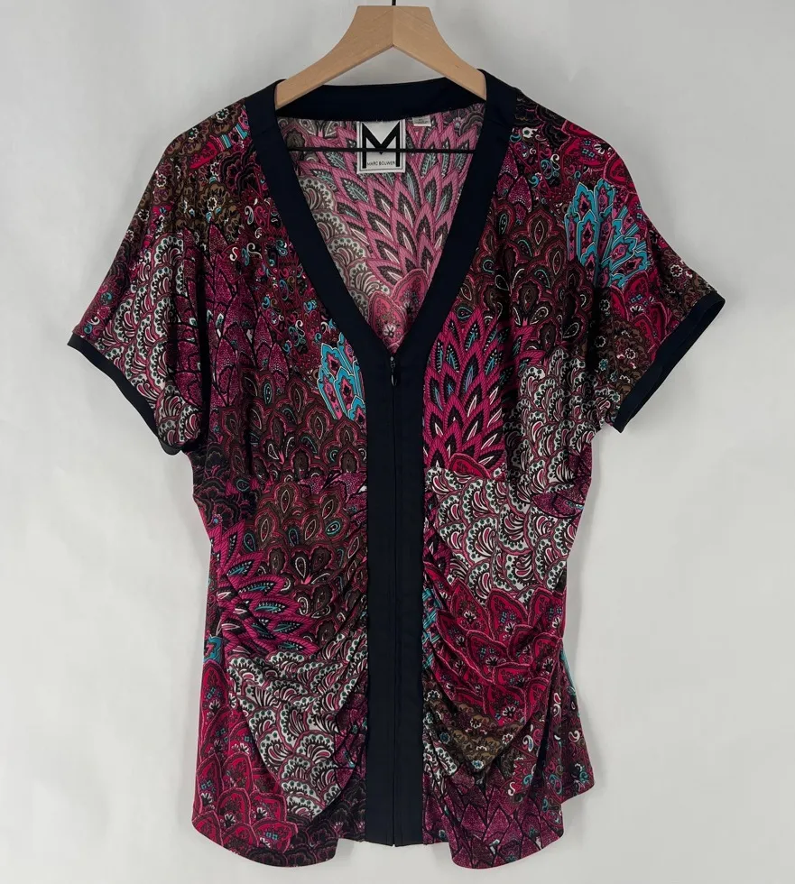 Marc Bouwer Pink Blue Paisley Feather Patterned Zip Front Dolman V-Neck Blouse Size XL Elegant V-neck blouse with intricate pink and blue patterns. Features short dolman sleeves and a flattering fit. lightweight stretchy ruched gathered front full zip front
