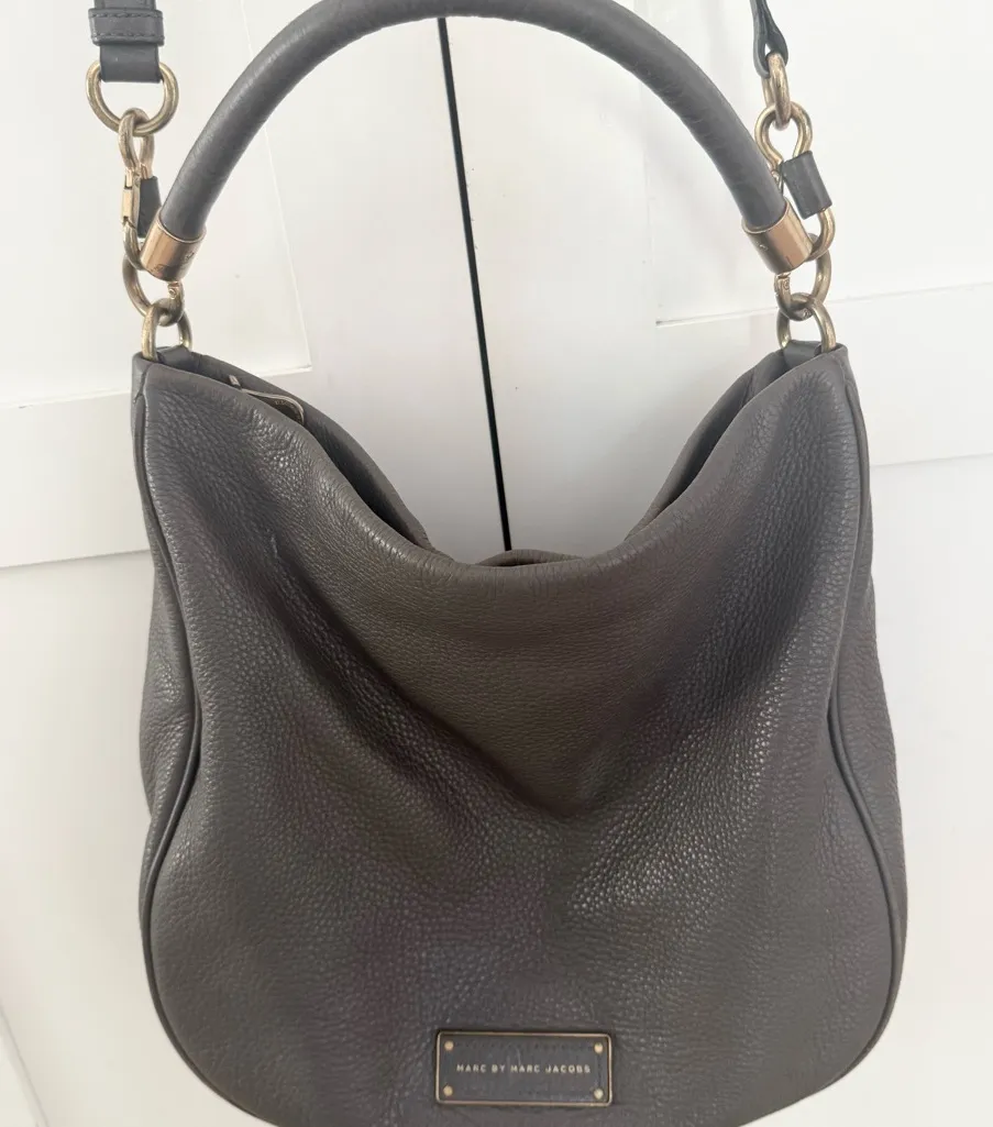 Elegant gray leather shoulder bag with adjustable strap. Perfect for everyday use. Measures 1 ft x 1 ft when layed flat. Super roomy inside and depth is huge. You can fit a lot of items in here if you desire You can take off the strap and use it as a hand or shoulder bag It’s a nice grayish color. In good condition overall, however there are some marks or peeling as shown. One on front left and another on back bottom right. Please See last few pictures. Make an offer, you just never know