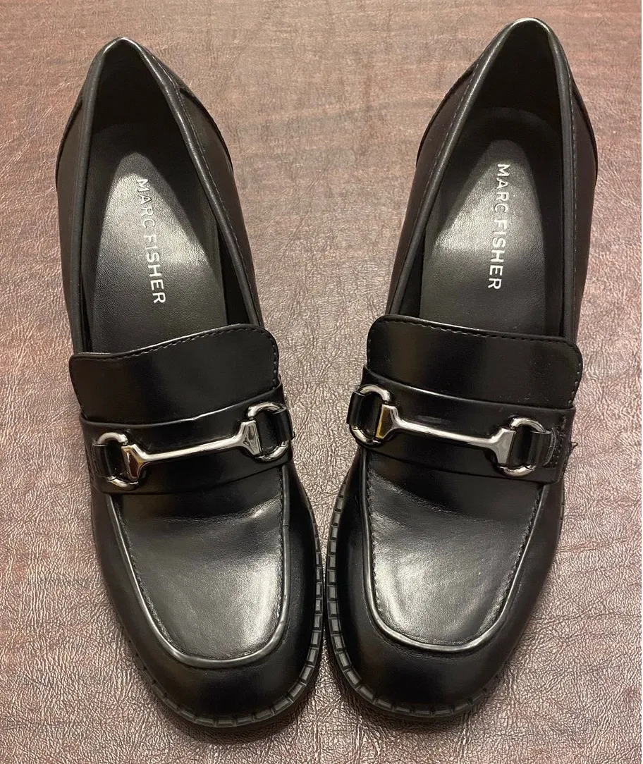 Marc Fisher Black Heeled Loafers Size 6M Block Heel Horsebit Lug Sole Shoes Classic and sophisticate... Show more