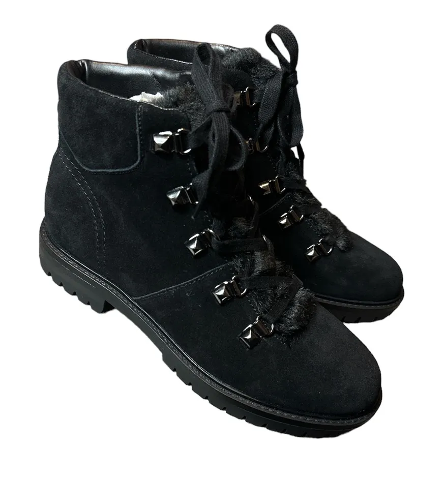 Lace up ankle boots Faux fur lined the tongue only Silver accents Leather and faux-fur upper, lac... Show more
