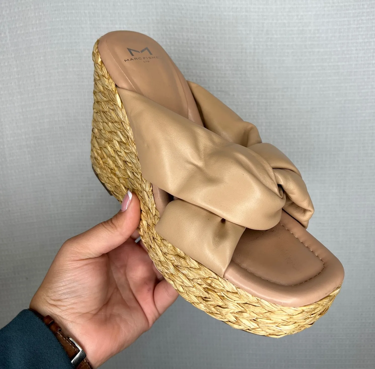Chic statement footwear for warmer weather: women's sandals showcasing a raffia wedge platform. These sandals feature a distinctive knotted design across the upper, adding an element of contemporary flair. The neutral tone complements the woven texture of the wedge, offering a versatile pairing with a variety of outfits. Color: Beige / nude Upper Material: Leather Heel Style: Wedge Features: Platform, Knotted, Espadrille, Raffia Wedge, Square Toe Accents: Knot Character: Bohemian, Coastal Chic Type: Sandal Model: ML Navina Puffy Twist Keywords: Marc Fisher LTD, Womens sandals, Wedge sandals, Platform sandals, Espadrille sandals, Raffia wedge, Knotted sandals, Square toe sandals, Beige sandals, Summer footwear, Casual sandals, Size 10M, ML Navina