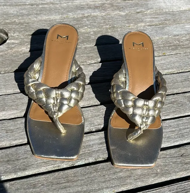 Marc Fisher Norsa Block Heel Braided Sandal silver Leather Women’s size 7 Worn once- has a few small... Show more
