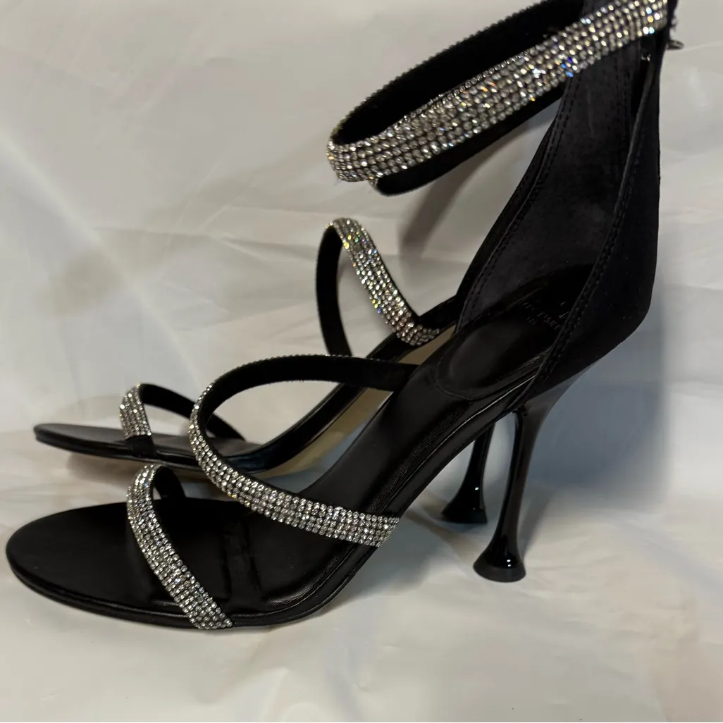 Chic black heels with sparkling silver rhinestone straps. Perfect for elegant occasions. Approximate... Show more