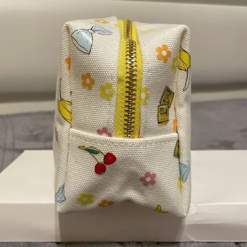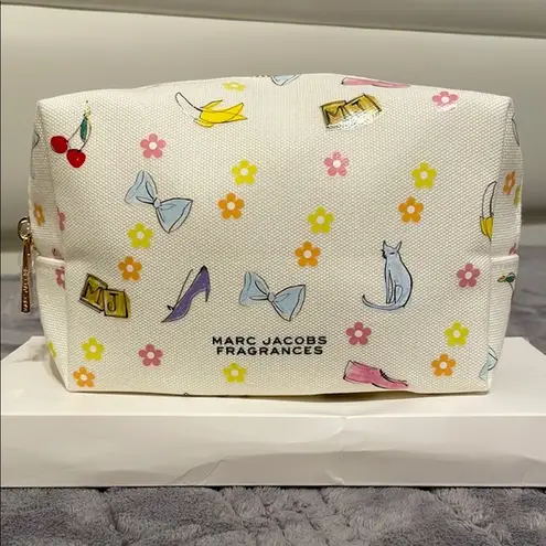 White cosmetic bag with colorful floral and playful designs. Features Marc Jacobs Fragrances logo.
