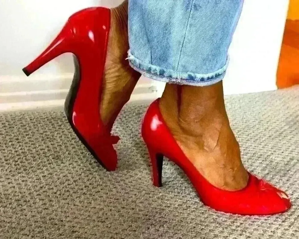 Vibrant red patent leather peep-toe stiletto heels. These eye-catching shoes feature a chic bow embe... Show more