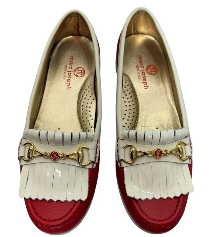 Marc Joseph New York Women's Lexington Golf Loafers in Red/Cream Patent Leather. Size 6.5. No Box. *Please see last pic. Inside of one shoe has some dark marks on the accent. Style: Loafer Department: Women Upper Material: Leather UK Shoe Size: 4.5 AU Shoe Size: 8.5 Features: Comfort, Arch Support, Padded, Cushioned, Buckle Occasion: Casual Insole Material: Leather Lining Material: Leather Outsole Material: Rubber Type: Flat Closure: Slip On Toe Shape: Closed Toe Pattern: Solid Keywords: loafers, moccasins, penny loafers, driving shoes, designer, fashion, preppy, smart casual, summer, spring, leather, slip on, flats