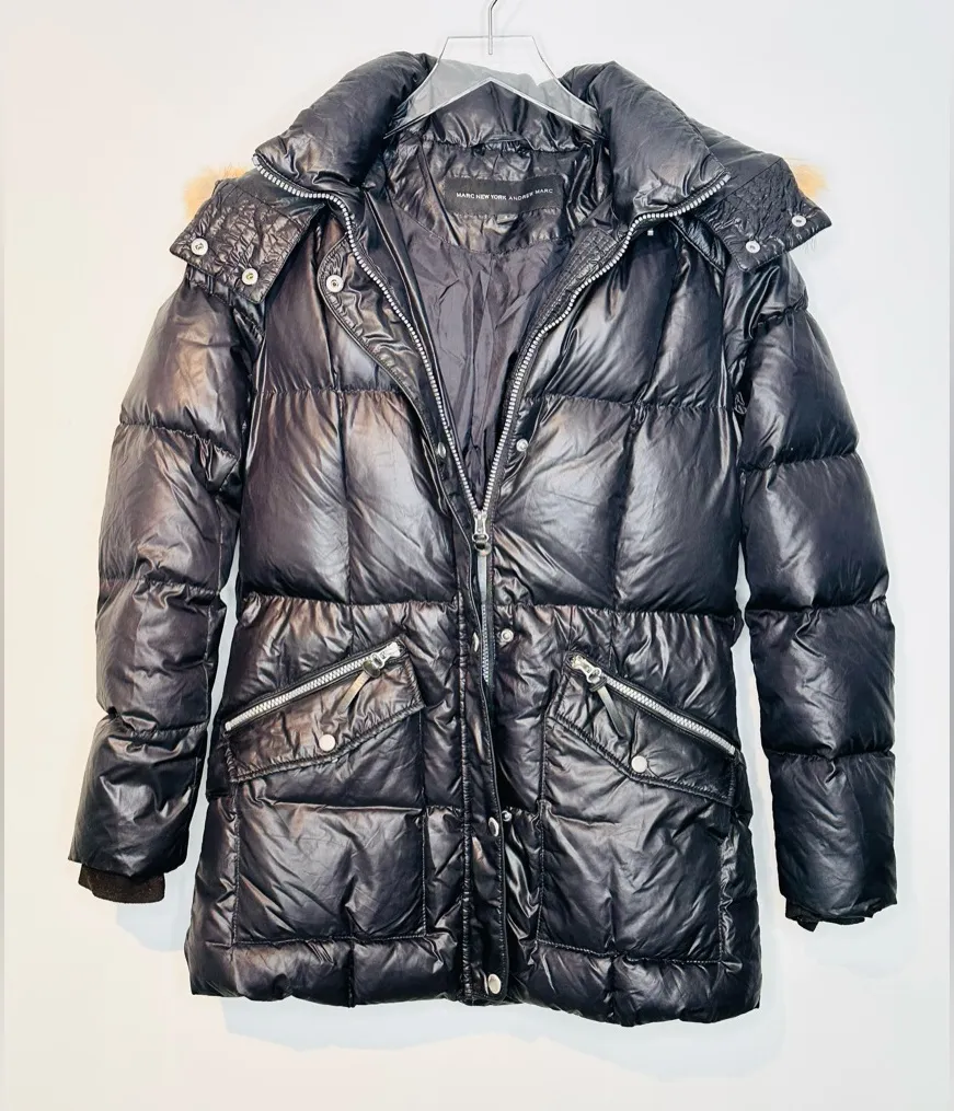 . Stay warm and stylish with this sleek black puffer jacket with a hood trimmed in luxurious coyote fur, while also being water resistant; making it a great choice for multi weather conditions. Coyote fur trimmed, detachable hooded neckline with metallic zipper down center front; flanked with snap buttons. Large patch pockets at front hips with additional angled zipper pockets. One large interior patch pocket on left side. Long sleeves with ribbed knit cuffs. Fully lined. Made in Myanmar. Fabric: Shell & Lining: 100% Polyester. Fill: 60% Down, 40% Waterfowl Feathers. Fur Trim: Coyote Fur. Care: Remove hood, machine wash body of coat. Dry clean hood with professional. Condition: Preloved, gently used. Size: S small. Measurements: Bust: 42”* Length: 29”* *All measurements are approximate.