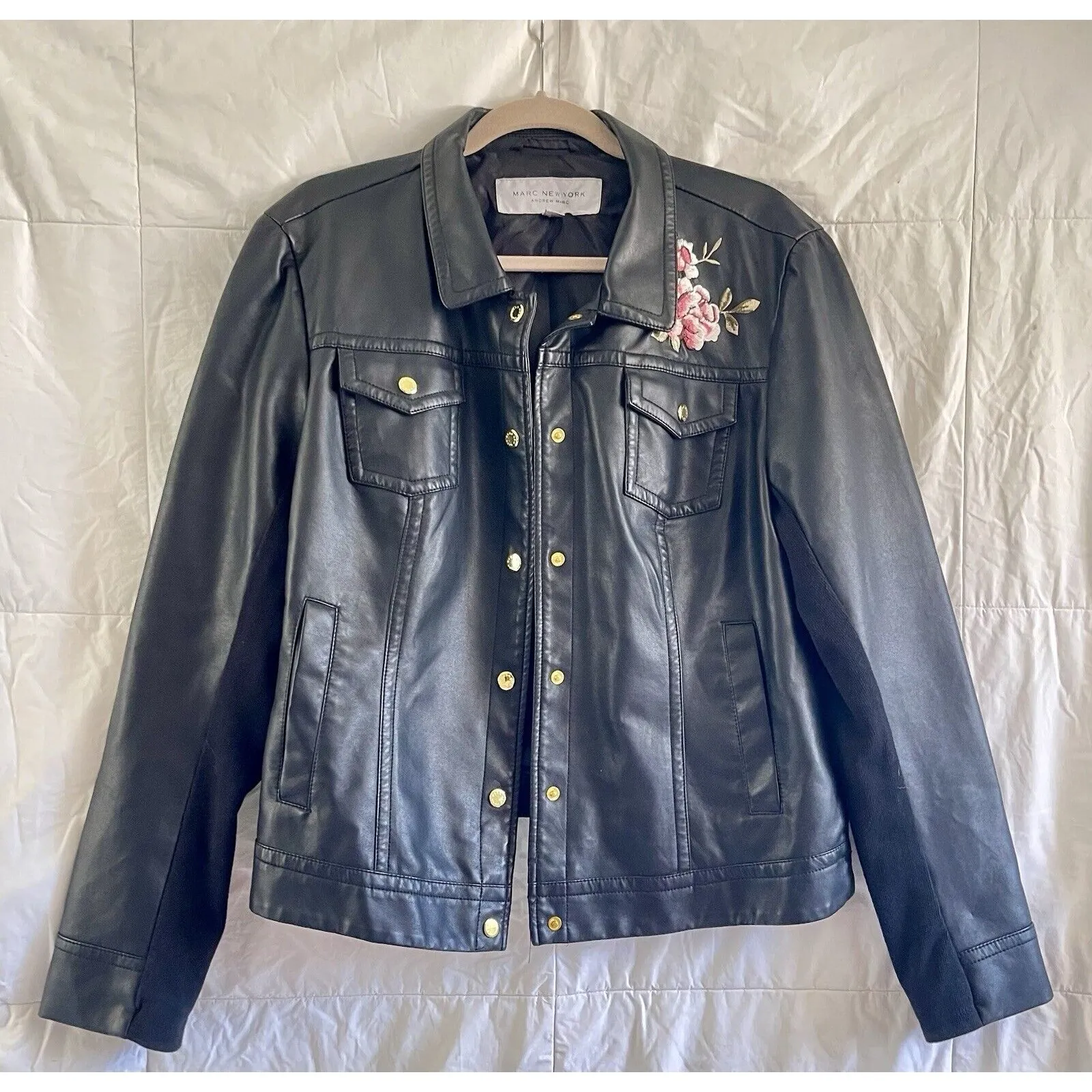 This stylish jacket from Marc New York is a must-have for any fashion-forward woman. With a beautiful floral embroidery pattern and a short length, it's perfect for layering over any outfit. The jacket features a button closure and pockets for added convenience. Made from high-quality faux leather and lined with polyester, this jacket is both durable and comfortable. It's machine washable, making it easy to care for. The XL size and regular fit ensure a flattering silhouette, while the long sleeves and short jacket/coat length make it suitable for winter, fall, and spring. Add this Marc New York jacket to your wardrobe today! Front length- 25.5 Sleeve length - 26.5 Back length - 22 Most items ship within 24 hours of payment.