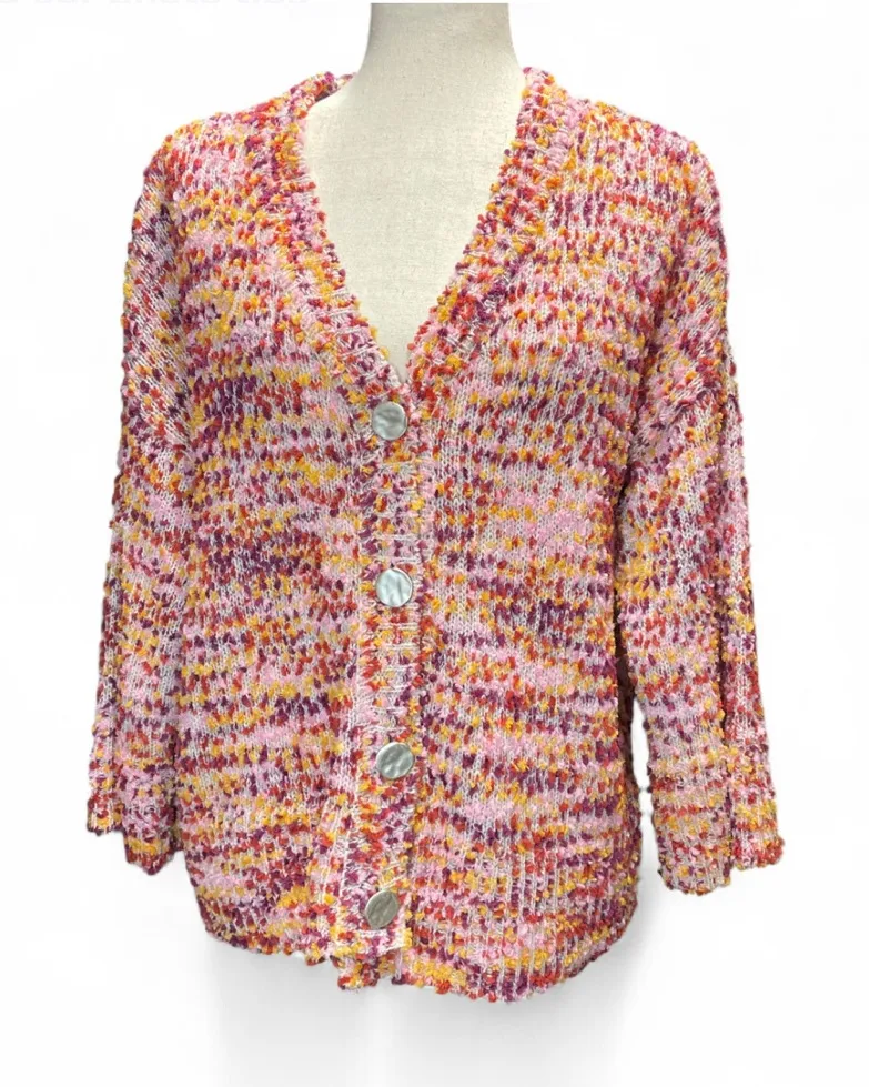 - silver tone button front closure - v-neck - multi-color boucle knit cardigan Flat lay measurement... Show more