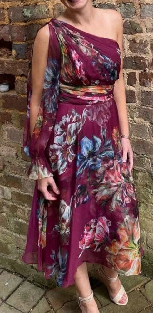 Rich in volume and romantic whimsy, this one-shoulder Marchesa Notte cocktail dress feels light and airy all night long. Burgundy floral printed chiffon (100% Polyester). Hourglass. Long sleeves. One shoulder neckline. Hidden side seam zipper with hook-and-eye closure. Fully lined. Size 2. Very good preowned condition. Some minor snags due to delicate nature of fabric. Approximate measurements: Pit to pit: 15” Length: 45” A3.