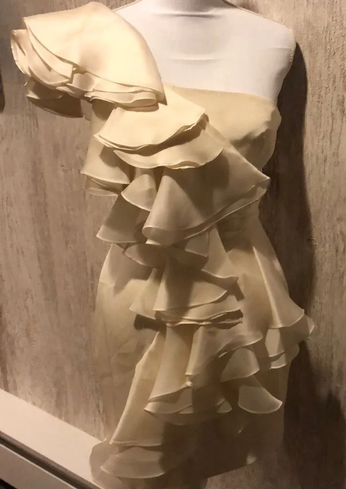 Marchesa Notte Ivory Silk One Shoulder Dress. Fitted dress with ruffle design. Ruffle at waist. One... Show more