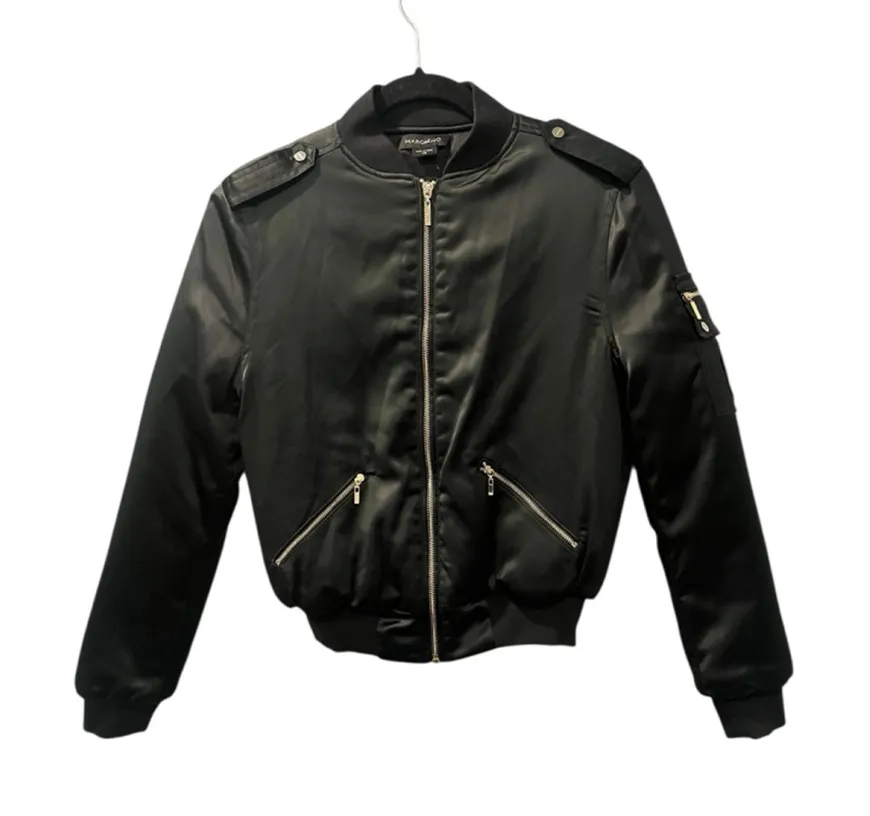 Measurements: Chest: 18" Length: 22" Sleeves: 24.5" Materials: Polyester, spandex This jacket feels amazing and luxurious! This is a black bomber jacket, identified by the label as Marciano, size XS. It features a full-zip front closure with gold-toned hardware, including zippers on two front pockets and a utility pocket on the left sleeve. The jacket has a ribbed collar, cuffs, and hem. Shoulder epaulets with snap closures are also visible. The interior appears to be lined and lightly padded. - Lightweight insulation - Stylish bomber design - Secure zipper pockets - Soft inner lining - Water-resistant fabric #LuxuryFashion #BomberJacket #CasualStyle #PufferJacket #Marciano