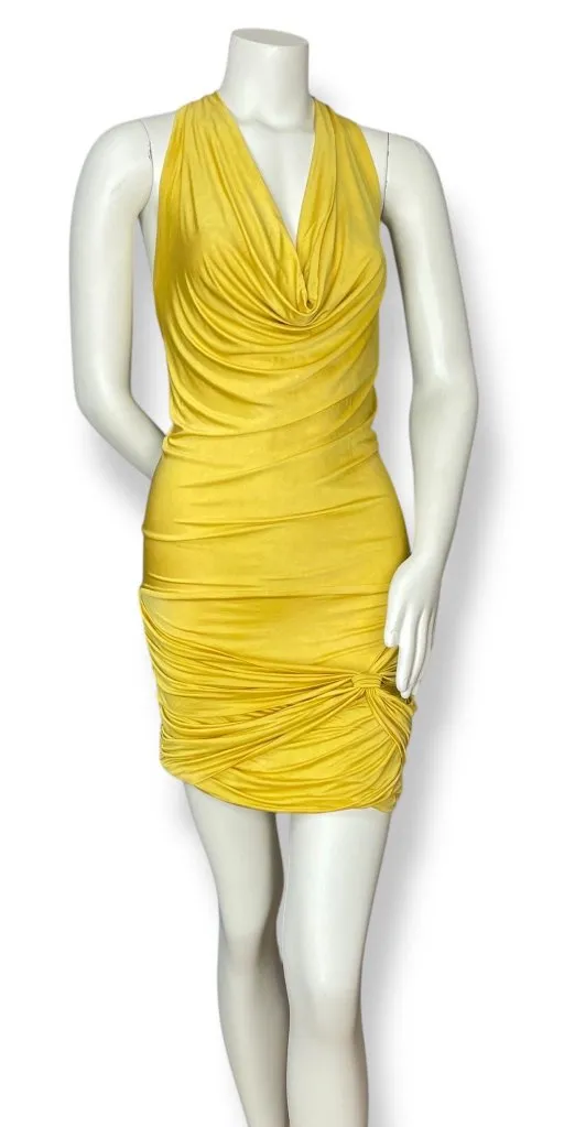 Marciano women's bodycon dress in yellow with a cowl neck, dramatic back, and ruching. Condition:... Show more