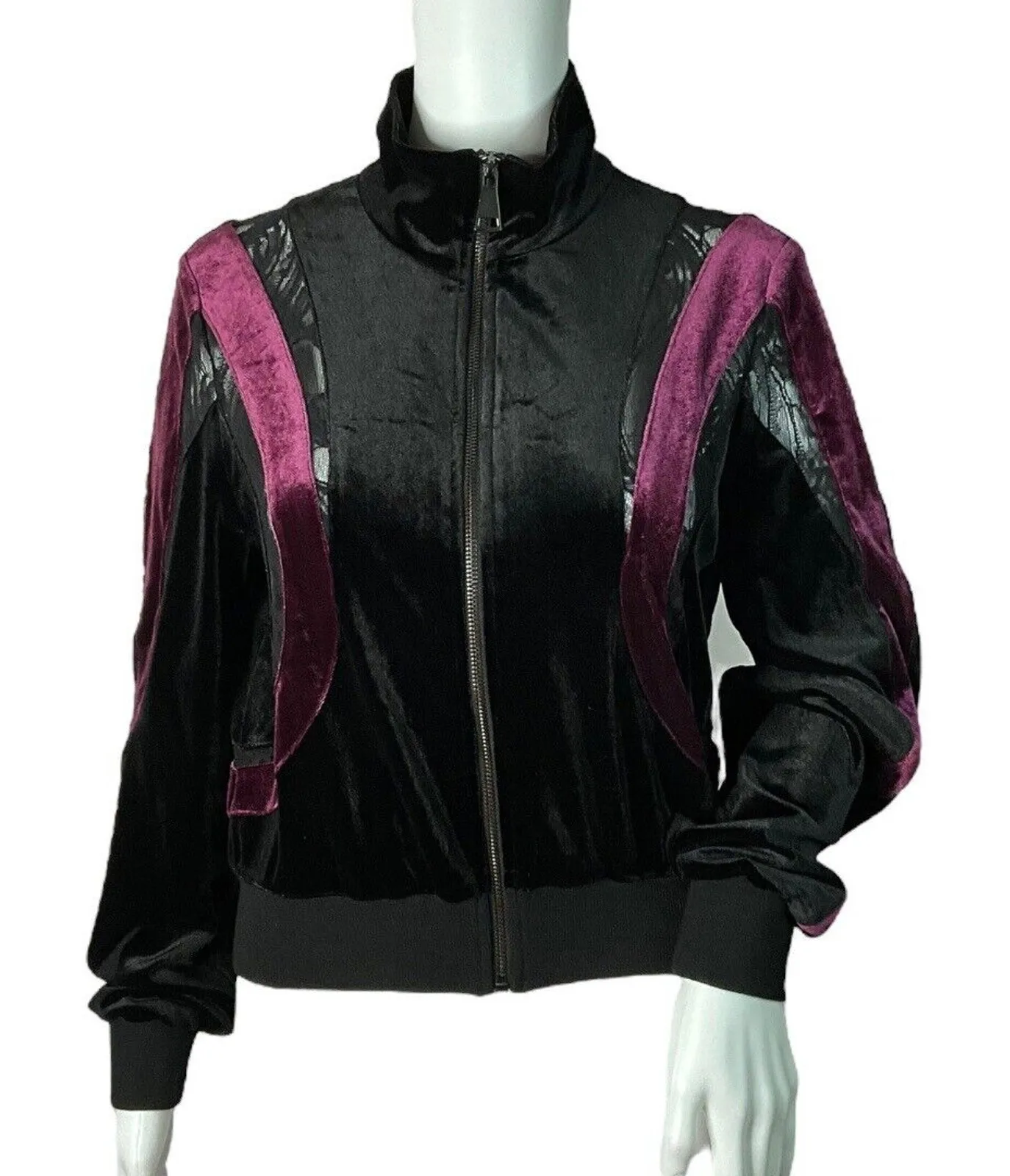 Marciano Jacket Womens XS Velour Black Purple Zip Up Lace Inserts Whimsigoth Women’s Size XS Extra Small Long Sleeve High Neck Full Zip Ribbed Trim Polyester Blend Casual Track Jacket Everyday Basic Fun Goth Retro Measurements are Approximate: Length 19” Armpit to Armpit 20” Gently Used Condition. No Rips Tears or Stains (2880)