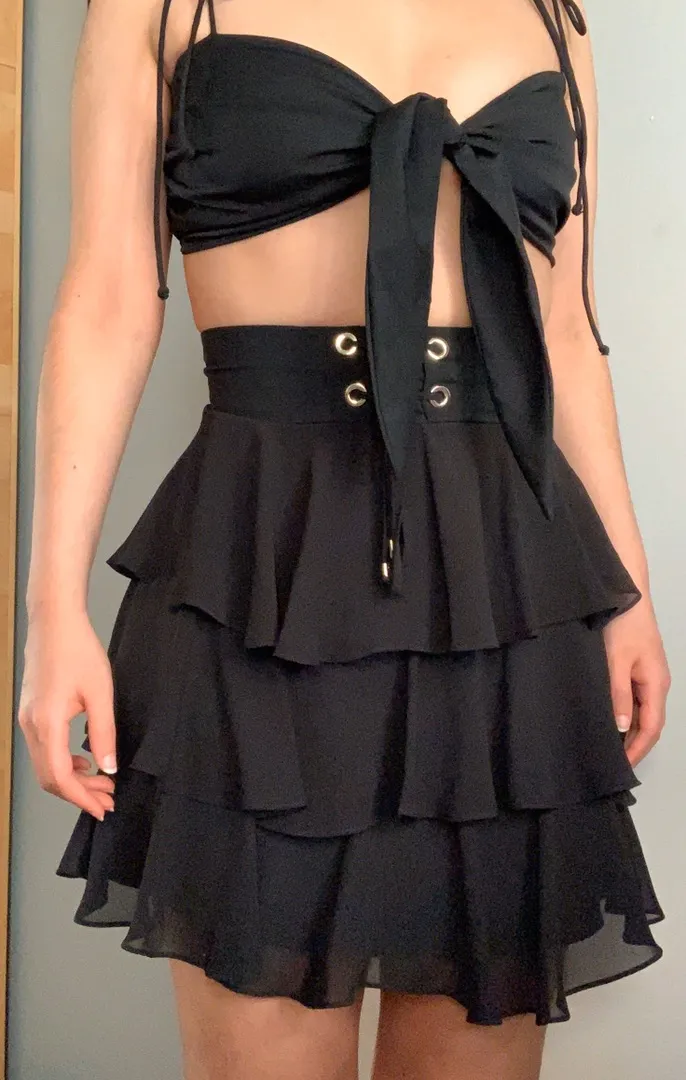Description from Marciano: Chiffon skirt. High rise, sits at natural waist. Tiered ruffle design. Contrast crepe-woven waistband with lace-up detail. Side zipper closure. Lined. Measures approximately 19.5" from waist to hem Shell, contrast and lining: 100% P Fits true to size.
