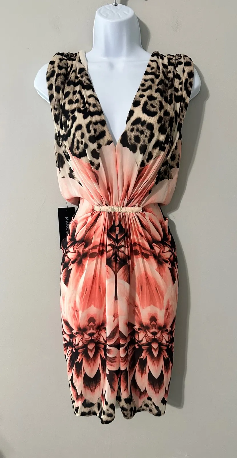 Please see pictures- new with tags but the small belt detail has peeling! A striking Marciano sheath dress showcasing a bold cheetah print juxtaposed with a vibrant floral design. This sleeveless dress features a deep V-neckline, elegant draping across the bodice, and a flattering ruched silhouette cinched with a decorative belt. The hemline offers a subtle cheetah print detail. Perfect for a night out or a special occasion. Style: Bodycon, Blouson Dress Length: Knee Length Department: Women Sleeve Length: Sleeveless Pattern: Animal Print Occasion: Party/Cocktail Fabric Type: Chiffon Theme: Leopard, Rose, Colorful Neckline: V-Neck Season: Summer, Spring, Fall Sleeve Type: Cap Sleeve Closure: Pullover Accents: Strap, Buckle, Pleated Keywords: Marciano, sheath dress, leopard print, floral dress, draped dress, ruched dress, v-neck dress, party dress, cocktail dress, statement dress, designer dress, unique print, sleeveless dress All items stored in polybags i ship within 2business days