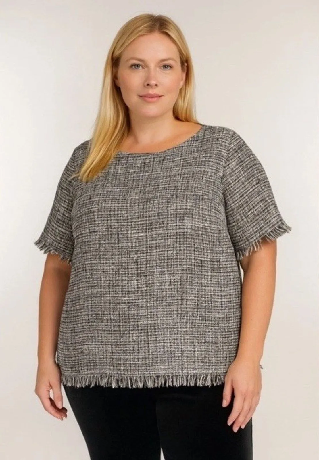Black and white with gold woven tweed top features fringed hems and short sleeves. Size 14, pit to p... Show more