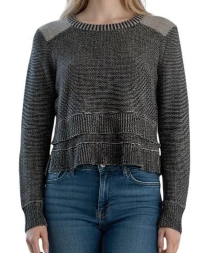 Elevate your knitwear collection with this captivating Margaret O'Leary sweater. The intricate textured knit creates a visually dynamic surface, while the contrasting ribbed neckline and shoulder panels add a touch of refined detail. A tiered effect at the hem with delicate ribbed banding introduces a subtle flair, making this piece a sophisticated choice for layering or wearing on its own. Experience the comfortable drape and unique design that sets this sweater apart. Style: Pullover Department: Women Material: 100% Cotton Machine Wash Neckline: Round Neck Sleeve Length: Long Sleeve Type: Sweater Features: Stretch Pattern: Geometric Sleeve Type: Raglan Sleeve Fabric Type: Knit Accents: Ruffle Knit Style: Waffle-Knit Season: Fall, Spring, Winter Fit: Classic Size Small Armpit to Armpit 34" - Shoulder to Hem 19 1/4" - Sleeve Length 22 1/2" All items are measured lying flat Keywords: Margaret O'Leary, textured knit, crew neck, long sleeve, charcoal grey, tiered hem, ribbed detail, sophisticated, modern, casual chic, everyday wear, knitwear, womens fashion