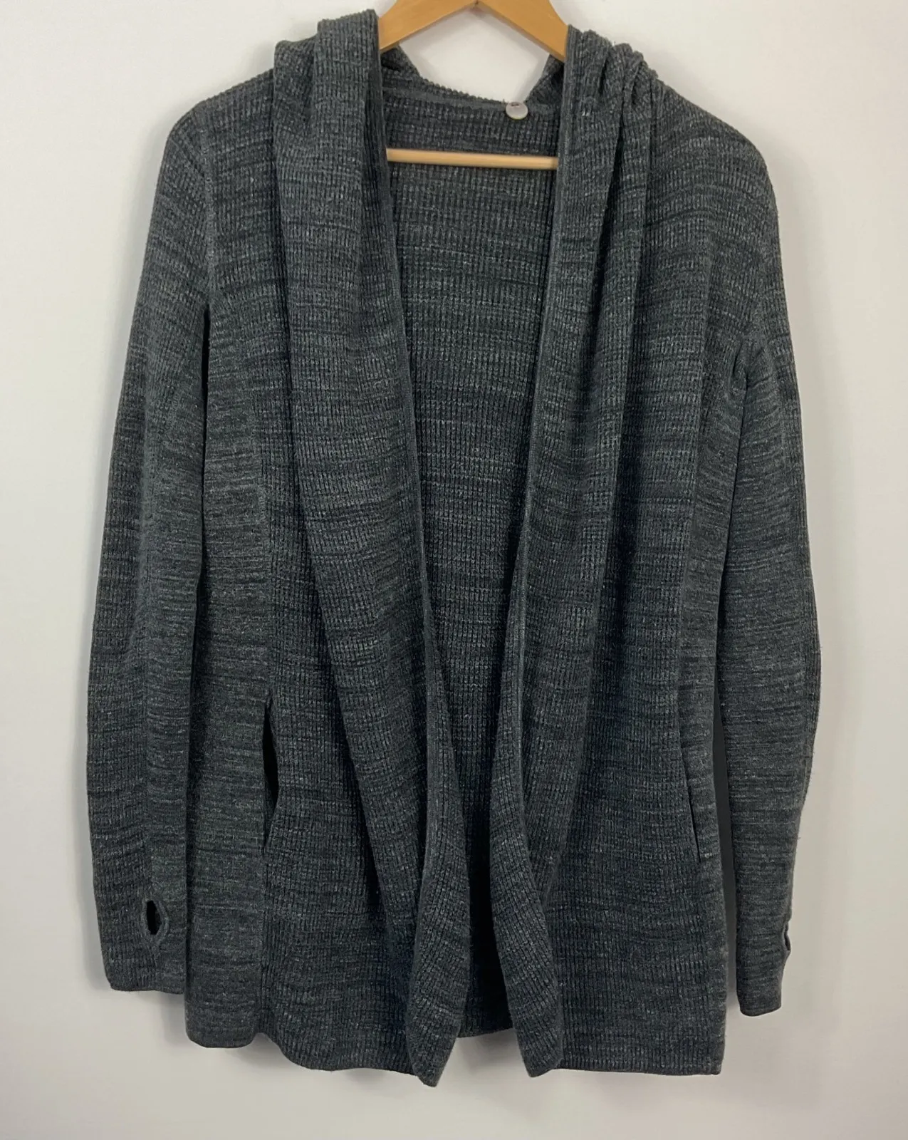 Margaret O'Leary hooded cardigan sweater in a textured grey black ribbed knit. Open front design with two front pockets and thumbholes on the sleeves for added comfort and functionality. A versatile layering piece. Please see all photos for any flaws or conditions. J33 Measurements: • PTP: 19.5 in • Length: 28 in Style: Cardigan Department: Women Type: Hoodie Closure: Pullover Features: Hooded, Open, Zip Pocket Fabric Type: Knit Pattern: Solid Material: 100% Cotton Accents: Button Sleeve Length: Long Sleeve Performance/Activity: Yoga, Gym & Training Season: Fall, Spring, Winter, Summer Fit: Relaxed Occasion: Casual, Activewear Keywords: Margaret OLeary, hooded cardigan, grey knit, ribbed sweater, open front, pockets, thumbholes, casual knitwear, loungewear, layering piece, cozy, soft knit
