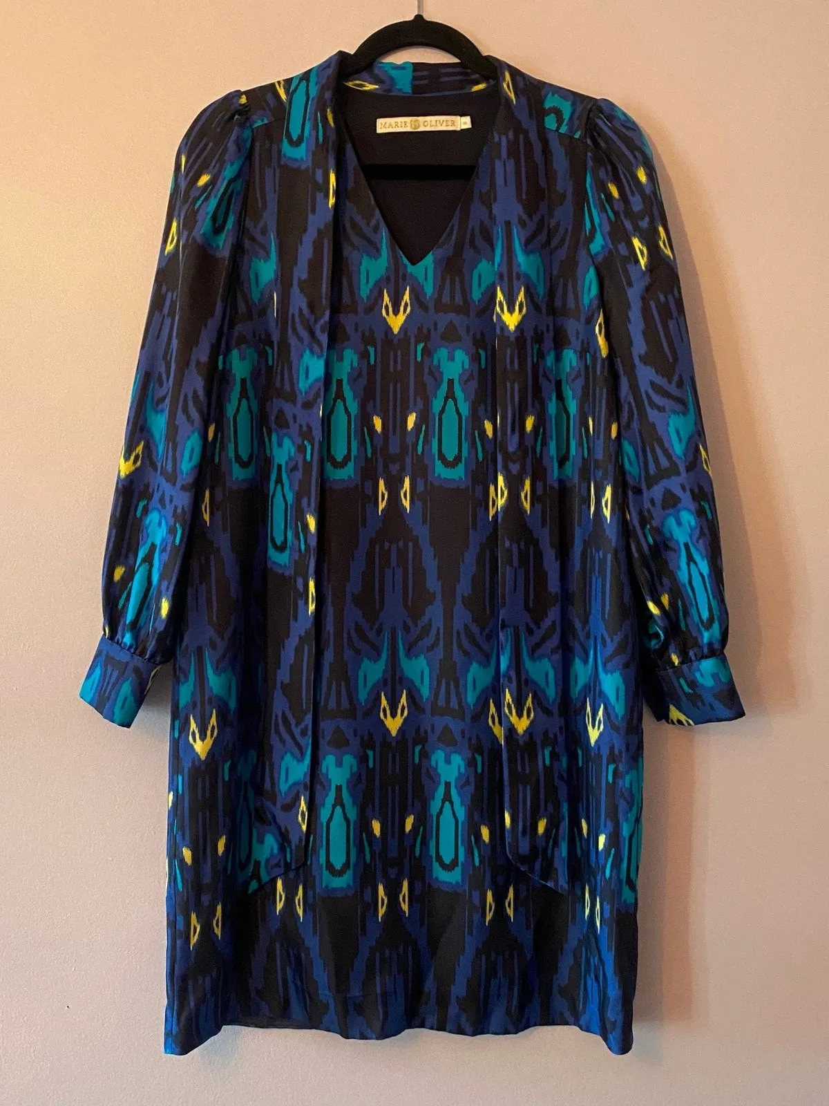 Make a statement with this stunning Marie Oliver mini dress! The beautiful blue silk fabric and abstract print create a unique, artsy look. Perfect for any occasion, this dress is sure to turn heads. It is in great pre-owned condition. Please see photos for more details! Item Details: - Brand: Marie Oliver - Size: XS - Item: Dress - Color: Blue - Detailing: Neck Tie - Condition: Pre-owned, Excellent - Style: Shift, Mini - Material: 100% Silk Measurements as pictured. Feel free to ask any questions! Reasonable offers accepted. artsy, silk, neck tie, mini, boho, abstract, shift