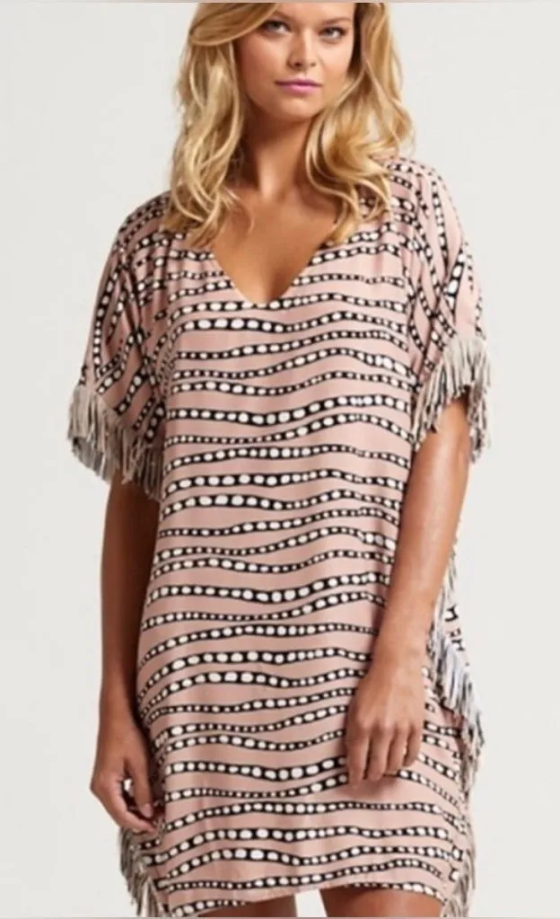 . A stylish caftan style dress with a fringe trim for an added flare; on a vibrant, wavy style horizontal print. V neckline with a loose fitting bodice with a straight hem. Dolman style short sleeves. Fringe trim on side seams. Fully lined. Pull on style. Made in China. Fabric: 100% Silk. Care: Dry clean only. Condition: Preloved, gently used. Size: L large. Measurements: Bust: 48”* Waist: 42”* Length: 34.5”* *All measurements are approximate.