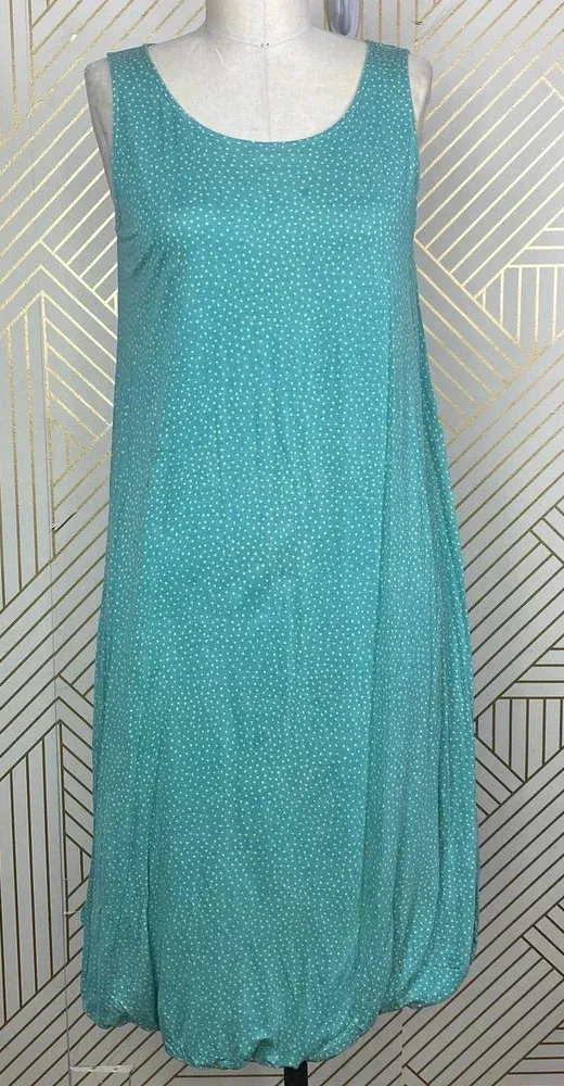 Marimekko Kissi Sleeveless Polka Dot Tank Dress in Turquoise with Yellow Dots. The Kissi tank dress is peppered with the miniature polka-dotted Kiss Kiss print by Marimekko designer Maija Isola. The bubble hem is gathered into tiny pleats, creating a unique and beautiful shape that hits at the knee. This dress is double-lined because of the bubble construction – no need to layer it over a slip. Pullover Round neck Sleeveless Yellow polka dots Tank dress **A few small dots on bust shown in photos Size US Small 100% lyocell Armpit to armpit is approx 17" Waist is approx 19" Hip is approx 24" Length is approx 38"