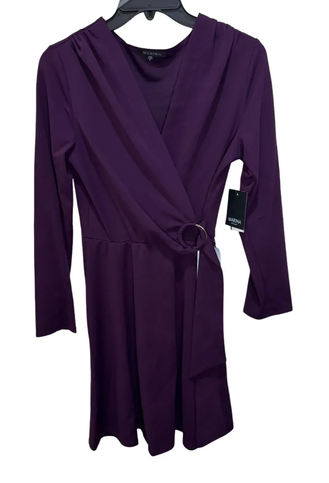 For slimming style and a flattering fit, this faux-wrap dress is an easy winner in the wardrobe game. - Color: Plum / Purple - Material: 96% polyester / 4% elastane - Scuba crepe fabric - Long sleeves - Surplice V-neck - Attached, adjustable belt with a gold-tone D-ring buckle - A-line / Faux wrap silhouette - Knee length - Unlined - Hand wash - Made in USA Flat lay measurements: 17” chest, 36” length, 22” sleeve, 12” waist